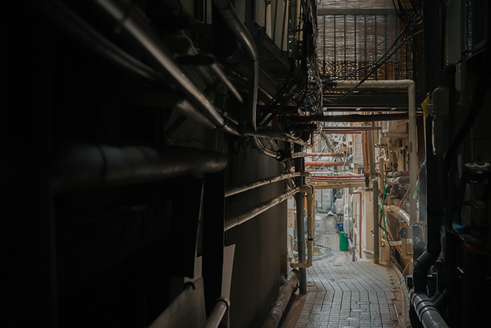 古い木造建築に格子窓、土壁、頭上に張り出す渡り廊下の欄干。張り巡らされた温泉パイプ